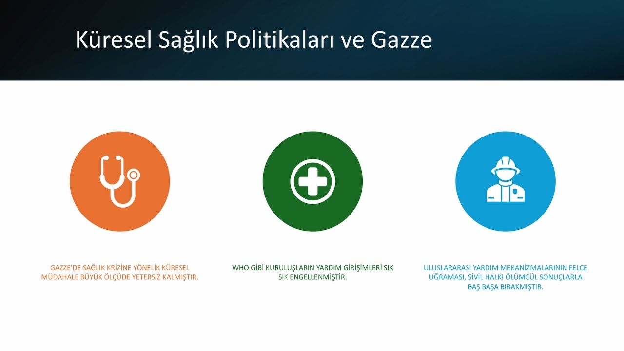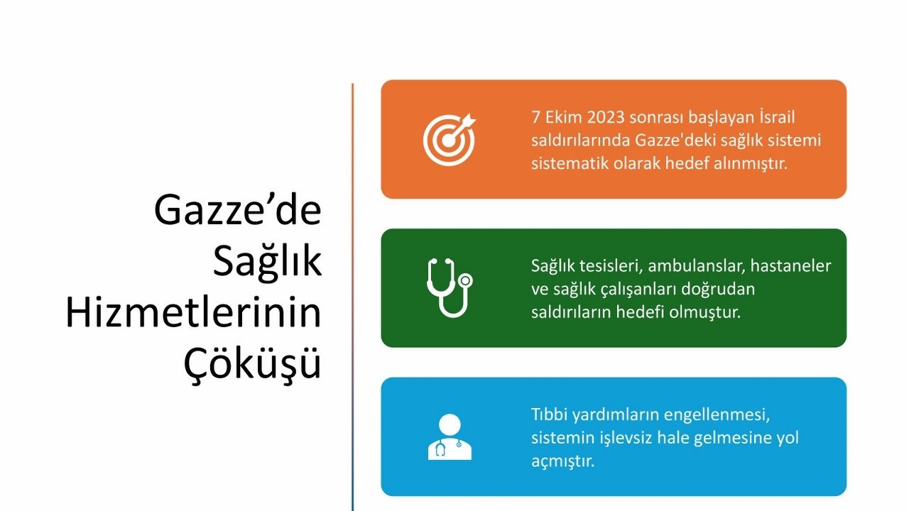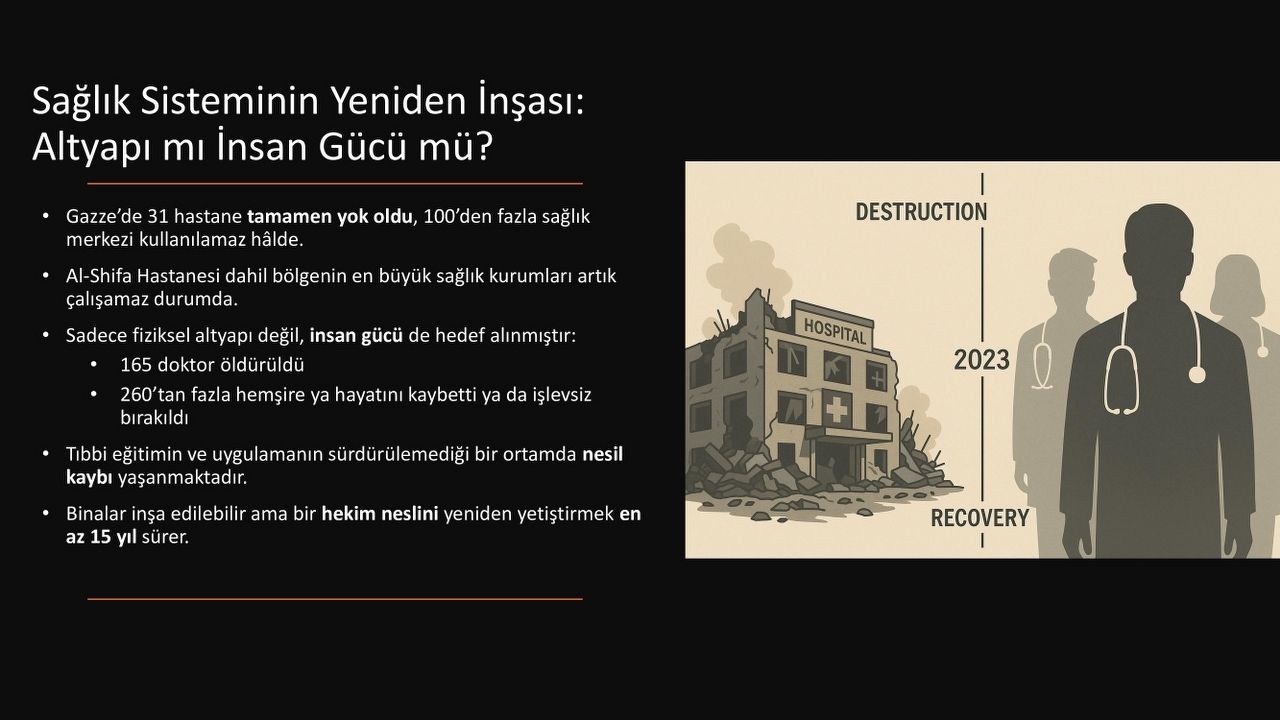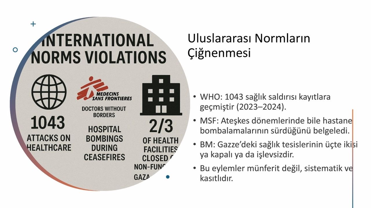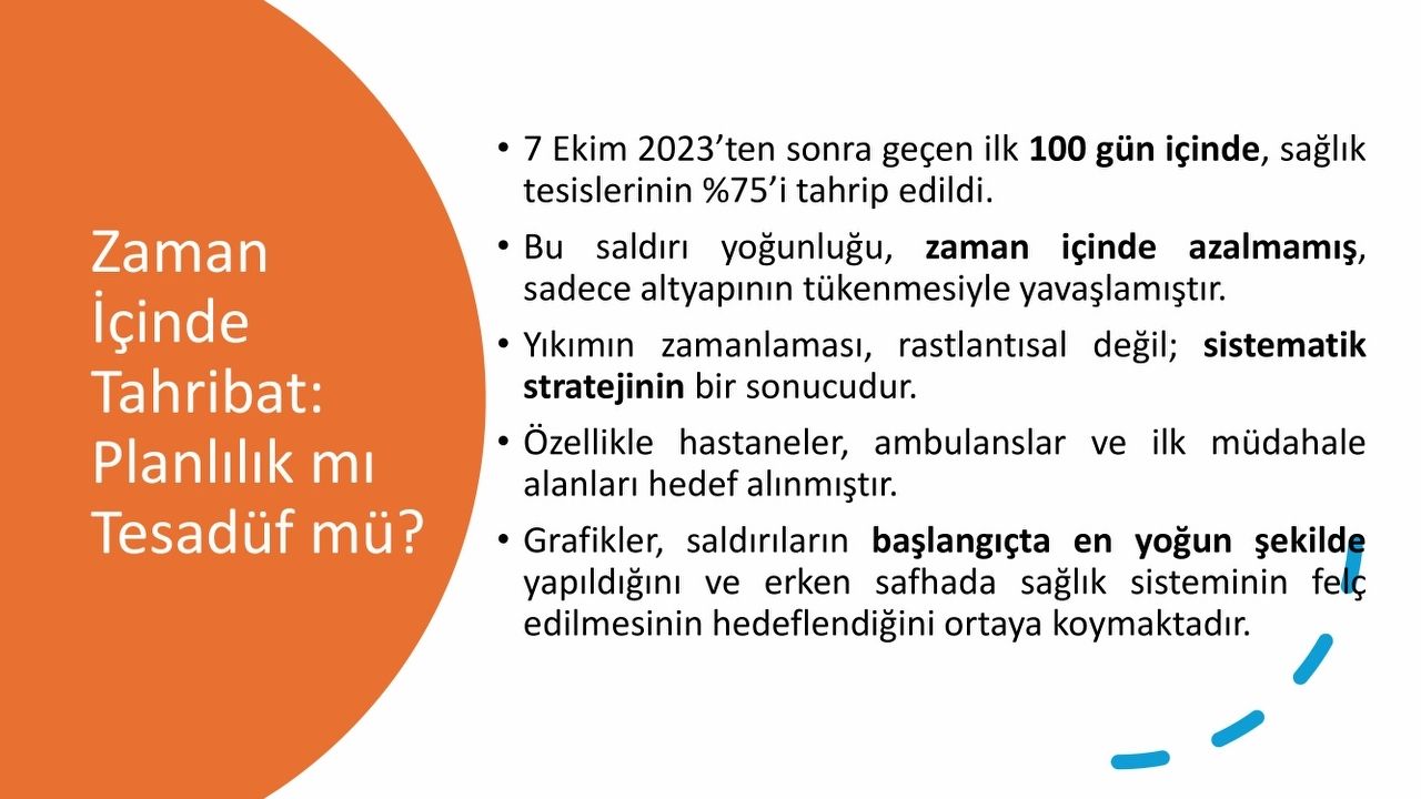 Sunumda, saldırıların rastgele değil, belli bir stratejiyle yürütüldüğü vurgulandı. Araç, “7 Ekim 2023’ten sonraki ilk 100 günde sağlık tesislerinin yüzde 75’i tahrip edildi. Bu hız, bir tesadüf değil; sistematik bir yok etme politikasının göstergesidir.” dedi. Özellikle ilk müdahale alanlarının hedef alınmasının, sağlık sistemini erken safhada felç etmeyi amaçladığını belirtti.