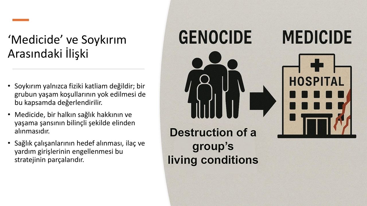 Dr. Araç konuşmasında, “Medicide” kavramını “bir halkın sağlık hakkının ve yaşama şansının sistematik biçimde elinden alınması” olarak tanımladı. Gazze’de hastaneler, ambulanslar ve sağlık personelinin doğrudan hedef alındığını belirten Araç, “Sağlık diplomasisi tarafsız bir alan olmalıydı; ama Gazze’de sessizlik, tıbbın savaşta bir silaha dönüşmesine izin verdi.” ifadelerini kullandı.