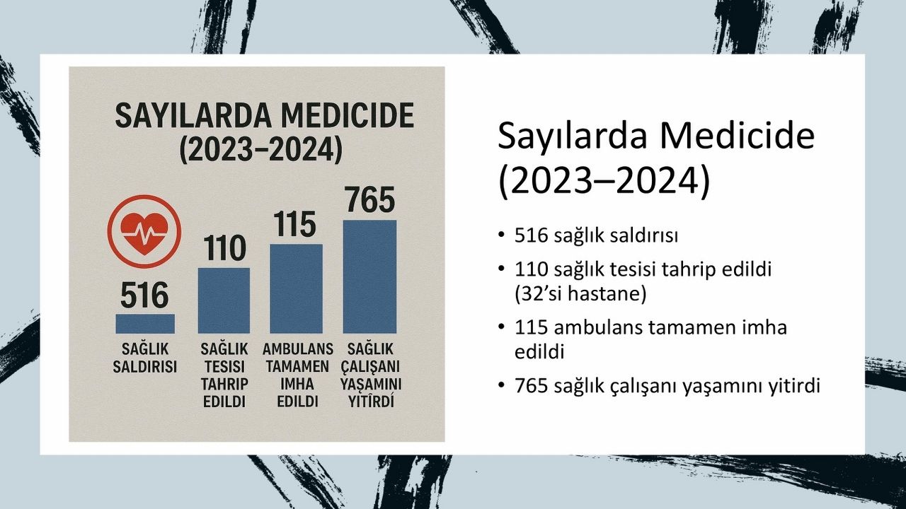Dünya Sağlık Örgütü (WHO), Birleşmiş Milletler (BM) ve Sınır Tanımayan Doktorlar (MSF) verilerini paylaşan Araç, 2023–2024 yıllarında 1043 sağlık saldırısı, 110 sağlık tesisinin tahribi (32’si hastane), 115 ambulansın imhası ve 765 sağlık çalışanının ölümü gibi çarpıcı rakamlar paylaştı.