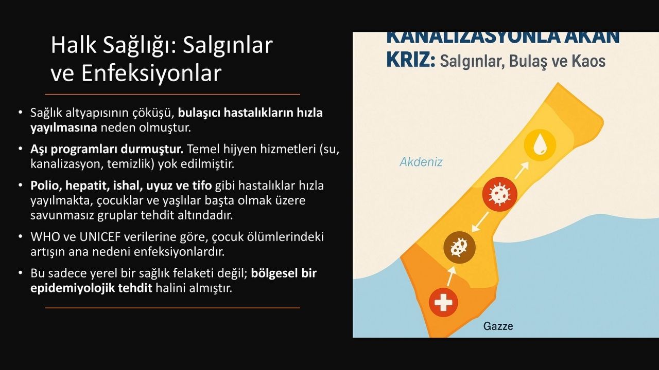 Gazze’de sağlık altyapısının çökmesiyle birlikte bulaşıcı hastalıkların hızla yayıldığını söyleyen Dr. Araç, aşı programlarının durduğunu, temiz su ve kanalizasyon sistemlerinin yok edildiğini aktardı. Polio, hepatit, tifo ve ishal gibi hastalıkların yeniden salgın haline geldiğini, en büyük risk grubunun ise çocuklar ve yaşlılar olduğunu vurguladı.