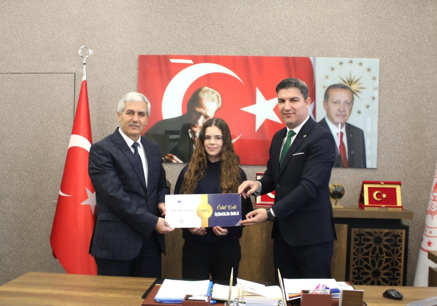 Türkiye genelinde düzenlenen yarışmada önemli bir başarıya imza atan öğrenci, okul idaresi ve danışman öğretmeni ile birlikte Mezitli İlçe Milli Eğitim Müdürünü makamında ziyaret etti.