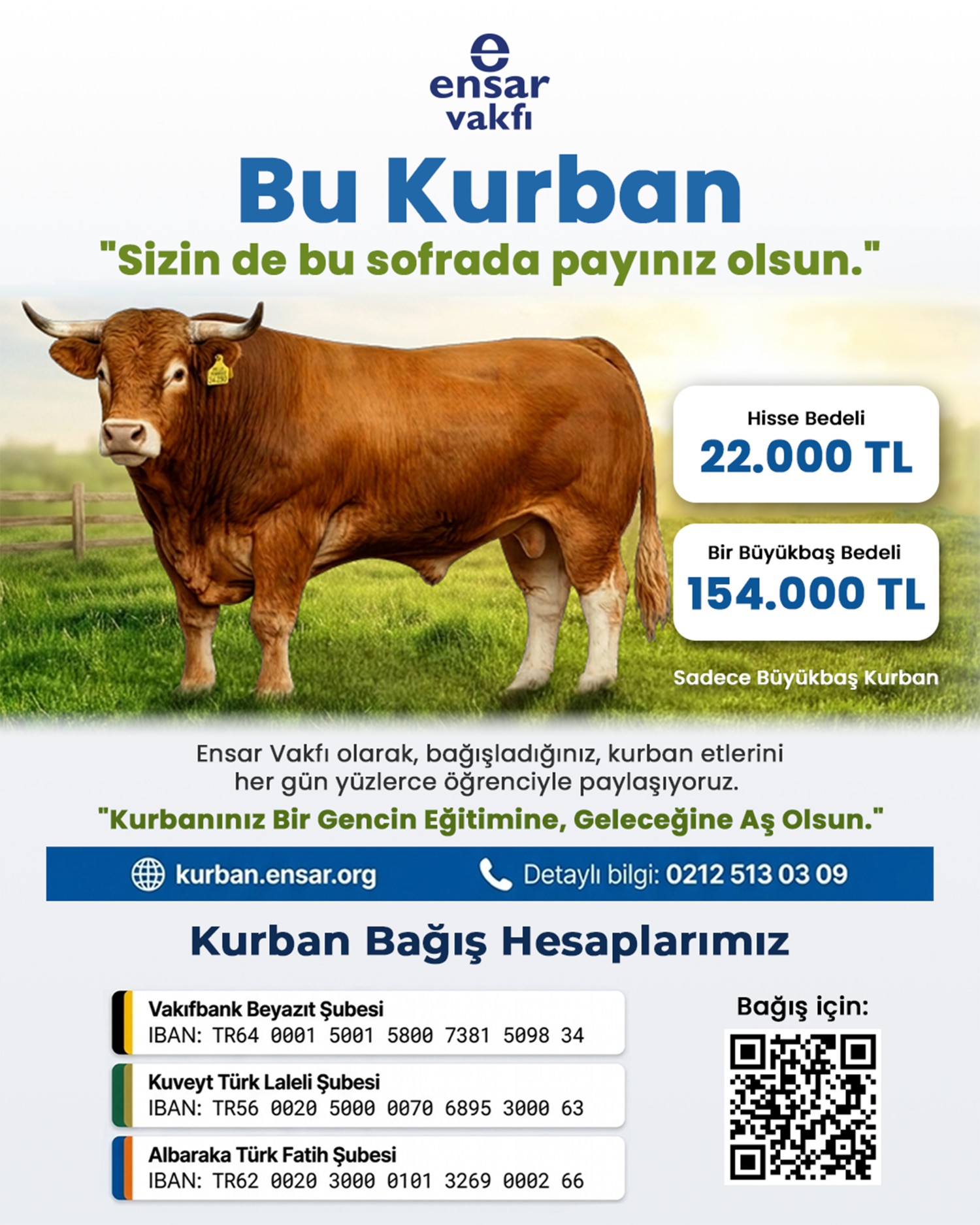 Bu hizmetlerin sürdürülebilirliği ve kalıcılığı sizlerin katkılarıyla mümkün olmaktadır. Nitelikli insan yetiştirme hedefimize ve eğitim çalışmalarımıza destek olmak için kurban bağışlarınızı bekliyoruz.